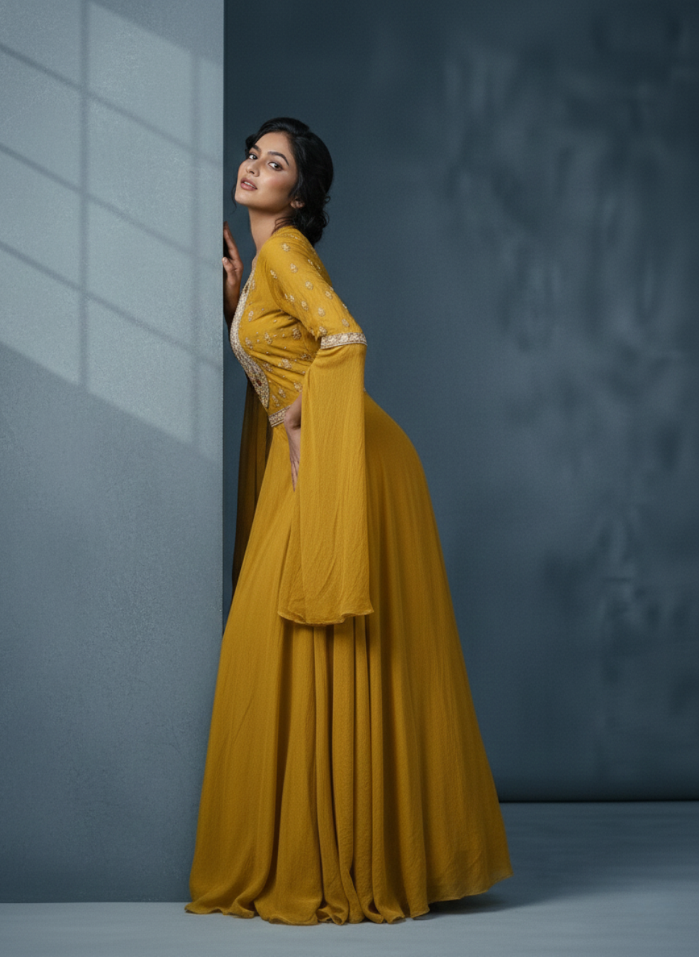 Home / Indo-Western / Gown / Crepe Royal Thread Yellow Gown