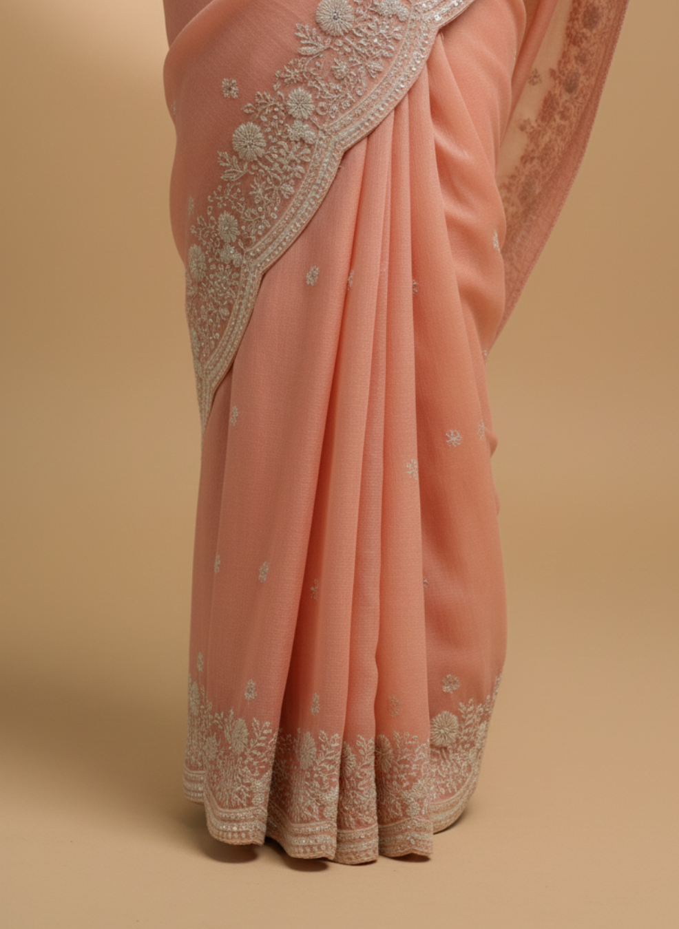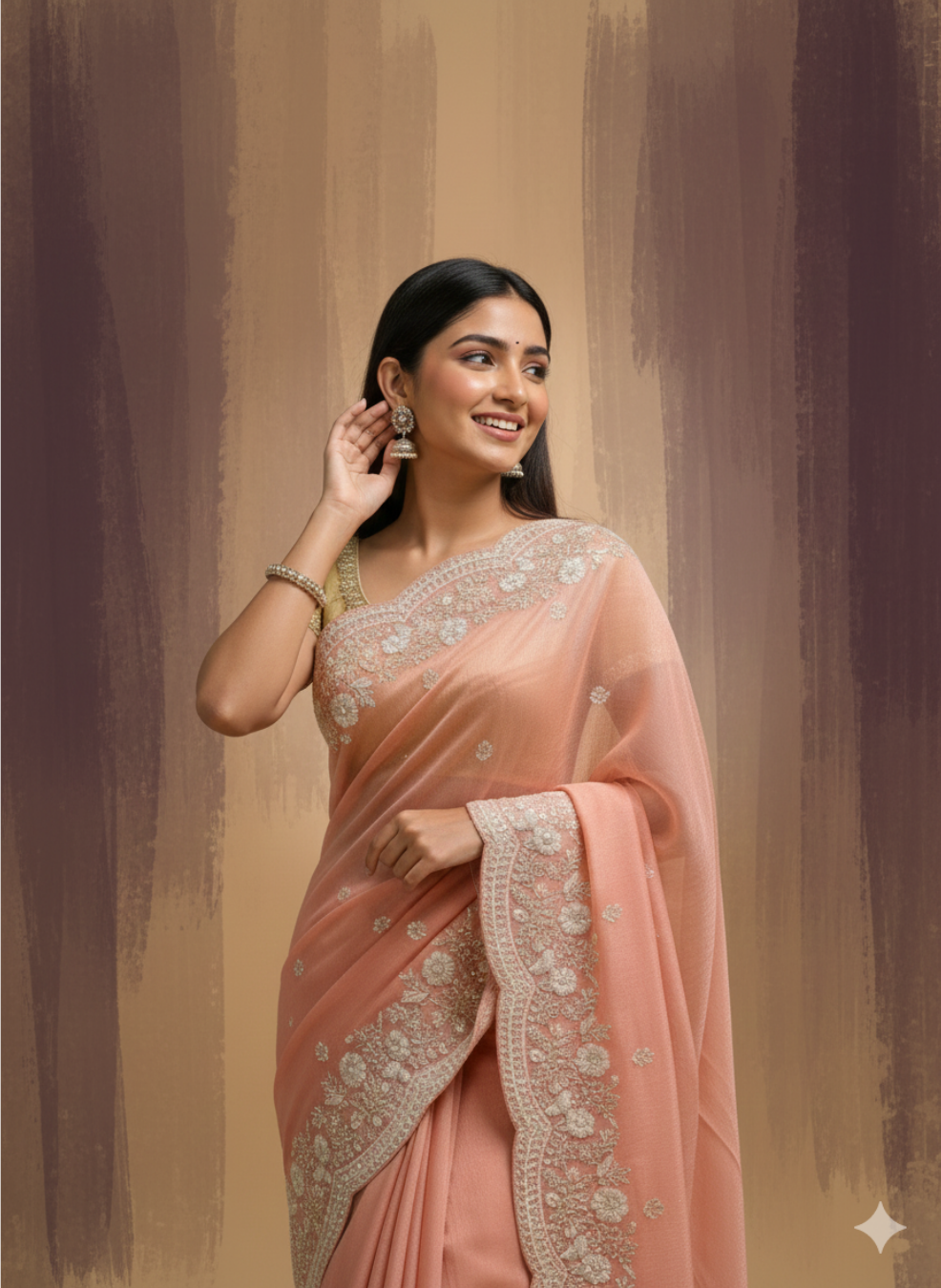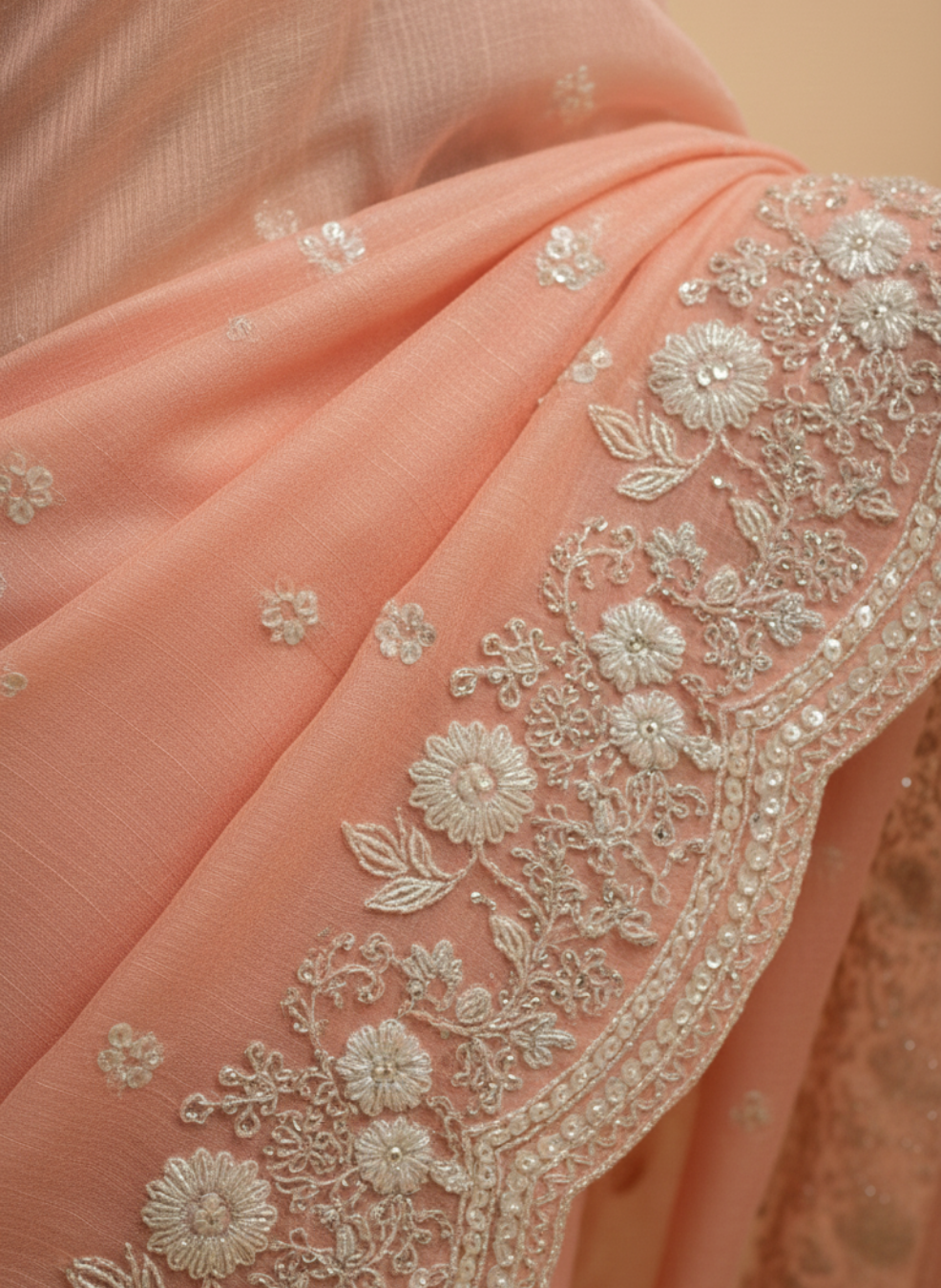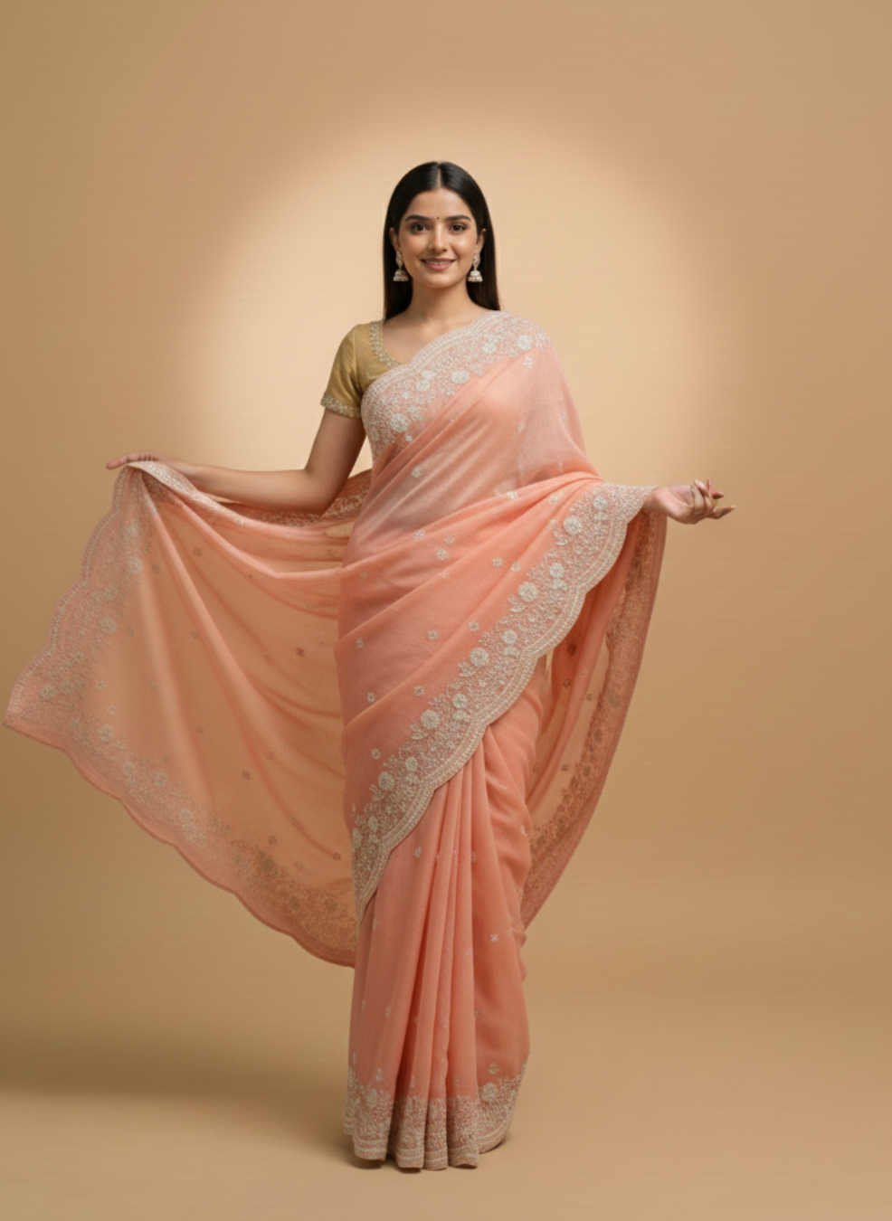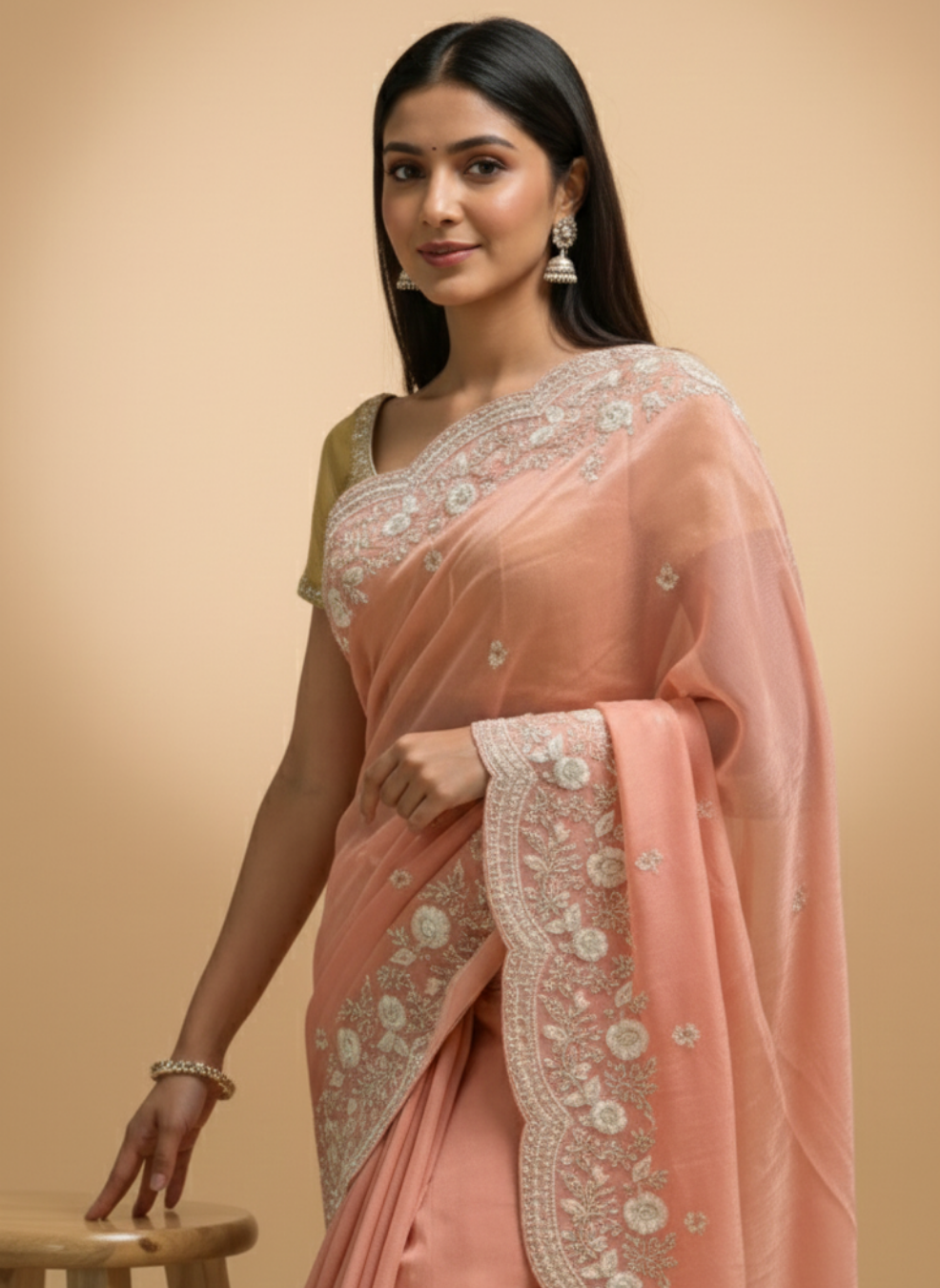 Be the first to review “Peach Organza Hand Zardozi Saree”