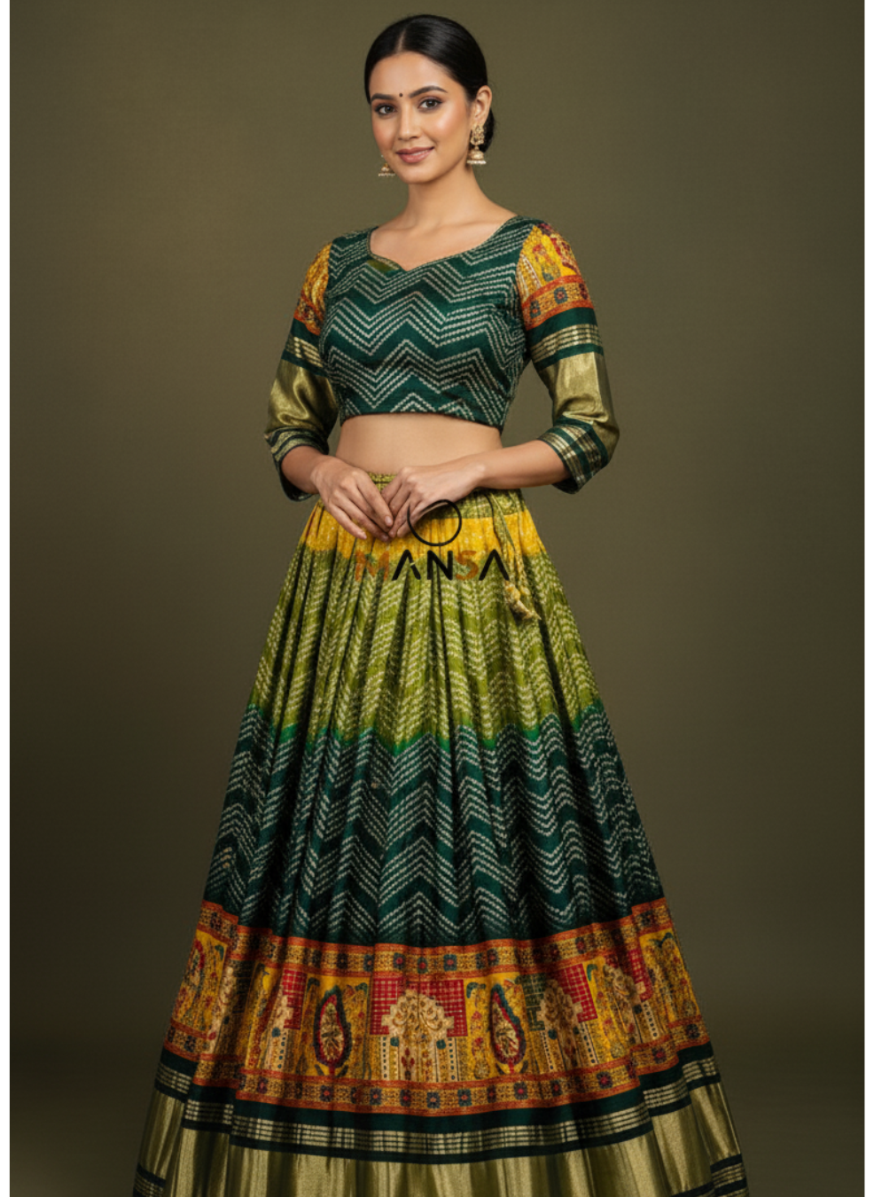 Celebrate heritage with the stunning Patola & Bandhani Fusion Lehenga. This dark green silk set features a gorgeous mix of authentic Bandhani (tie-dye) patterns on the skirt’s upper half and vibrant Patola/Pichwai prints on the elaborate bottom border. The look is anchored by a rich Zari-woven border and a zig-zag patterned blouse, making it a perfect, festive statement piece for Navratri, Sangeet, and traditional cultural events
